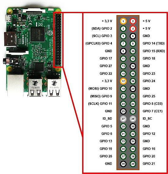 Im Bild 1 sieht man auf einen Blick die Beschaltung. Achtung: Die Anschlüsse der sichtbaren Pfostenbuchse sind gegenüber dem Raspi-Stecker vertikal gespiegelt.