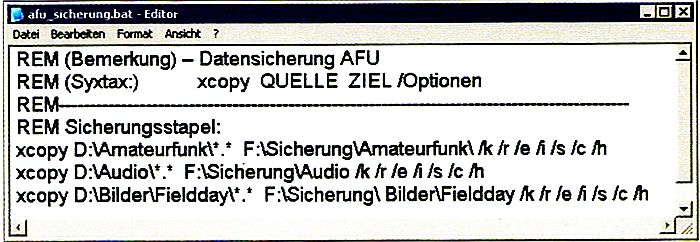 Nun probiert man, ob der Kopiervorgang tatsächlich wie gewünscht durchgeführt wird. Funktioniert alles, kann man nacheinander seine xcopy-Befehle Zeile für Zeile in die Datei afu_sicherung.bat eintragen.